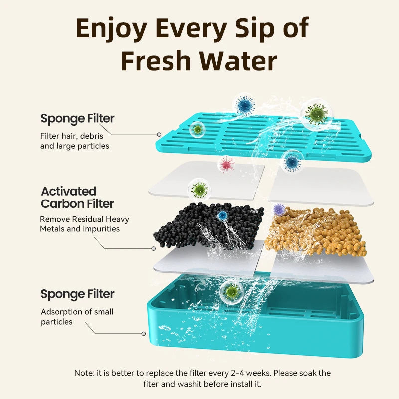 - Sponge filtration layer captures pet hair, food particles, and debris